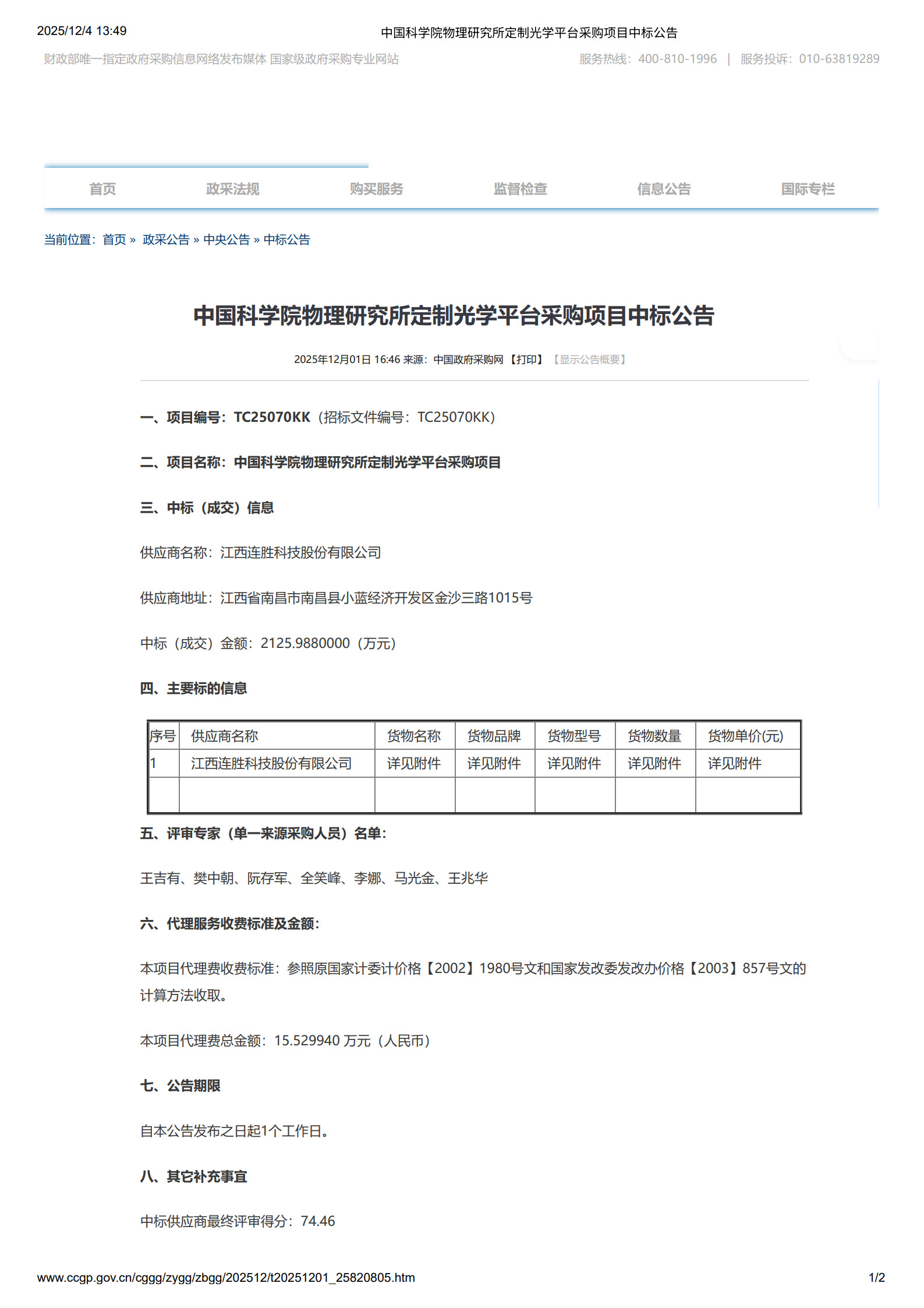 该项目编号为TC25070KX,招标文件编号TC25070KX,采购内容聚焦定制光学平台。江西连胜科技股份有限公司以2125.988万元中标金额胜出,中标信息经公示确认。